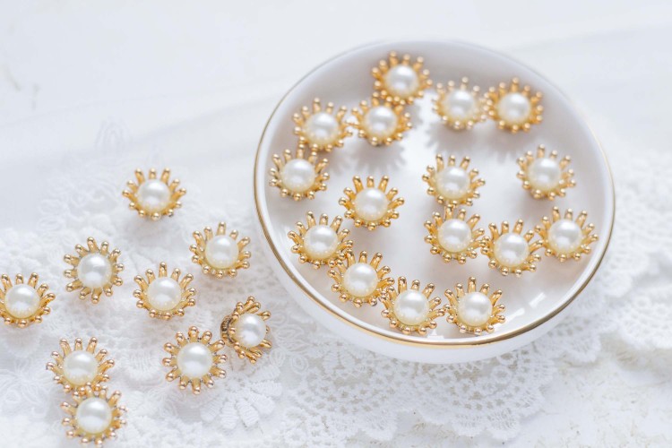 Disse vakre blomstersentrene kombinerer en perle i midten med en dekorativ gullramme som gir et elegant og eksklusivt preg. Perfekt som midtpunkt i håndlagde blomster til kort og album.